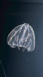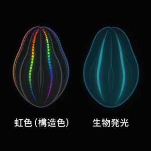 カブトクラゲの体表には「櫛板(繊毛列)」があり、それが動くと光をプリズムのように分光して虹色に輝くということらしいです。